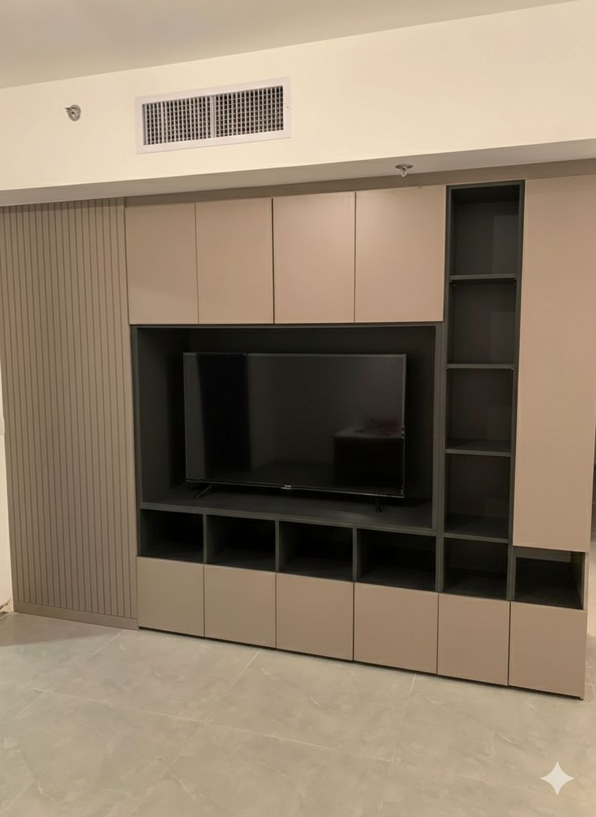 תאי תצוגה פתוחים: מדפים פתוחים בצד ובמרכז המיועדים לחפצי נוי, ספרים או מכשירי מדיה.