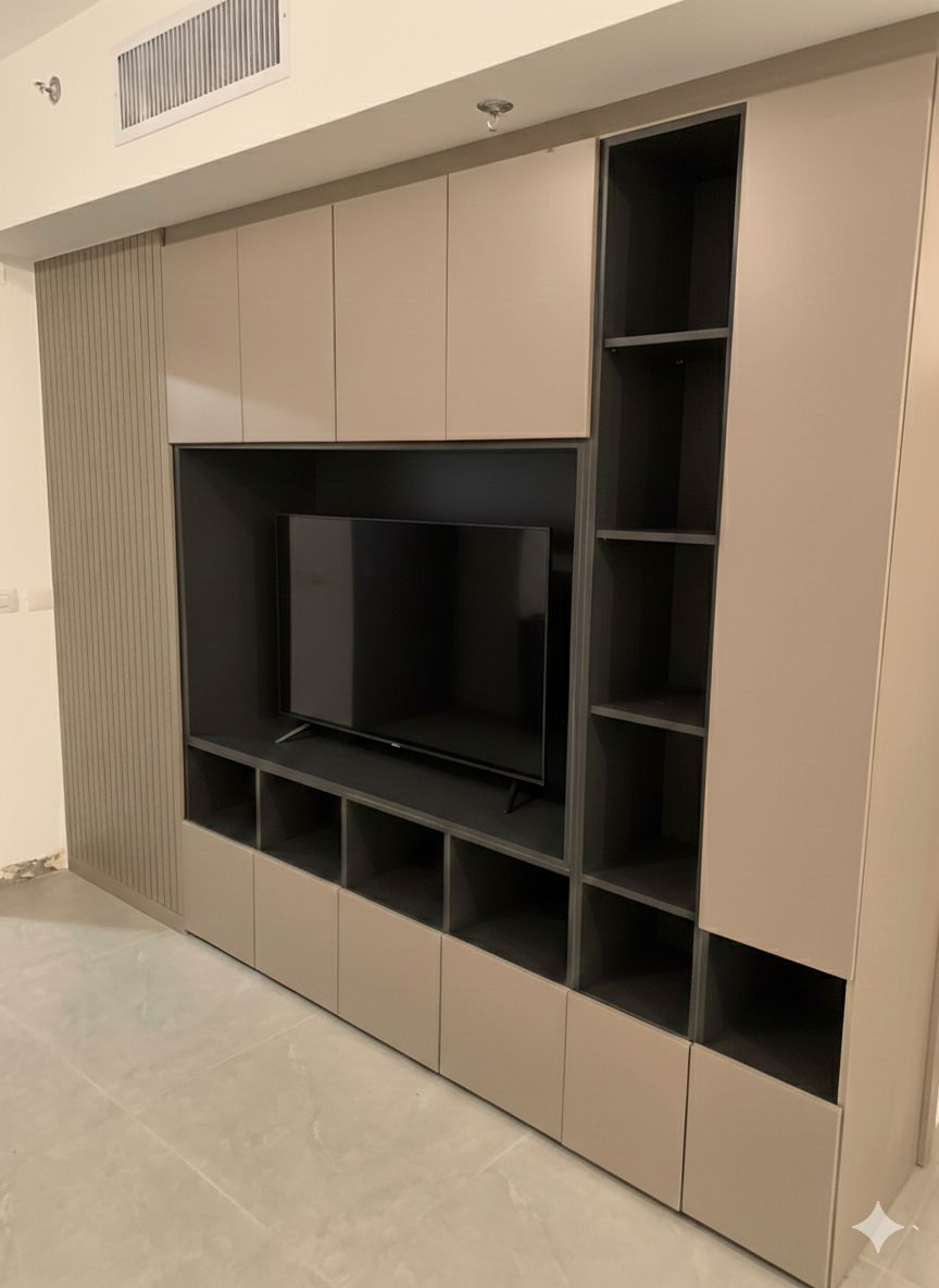 תכנון פונקציונלי: נישת טלוויזיה מרכזית רחבה וממוסגרת, הכוללת הכנה מובנית לנקודות חשמל ותקשורת למראה נקי מכבלים.