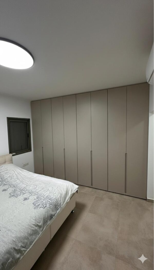 עיצוב “קו אפס”: הארון מתוכנן מהרצפה ועד התקרה, מה שיוצר מראה המשכי של קיר מעוצב ולא של רהיט כבד שתופס מקום.